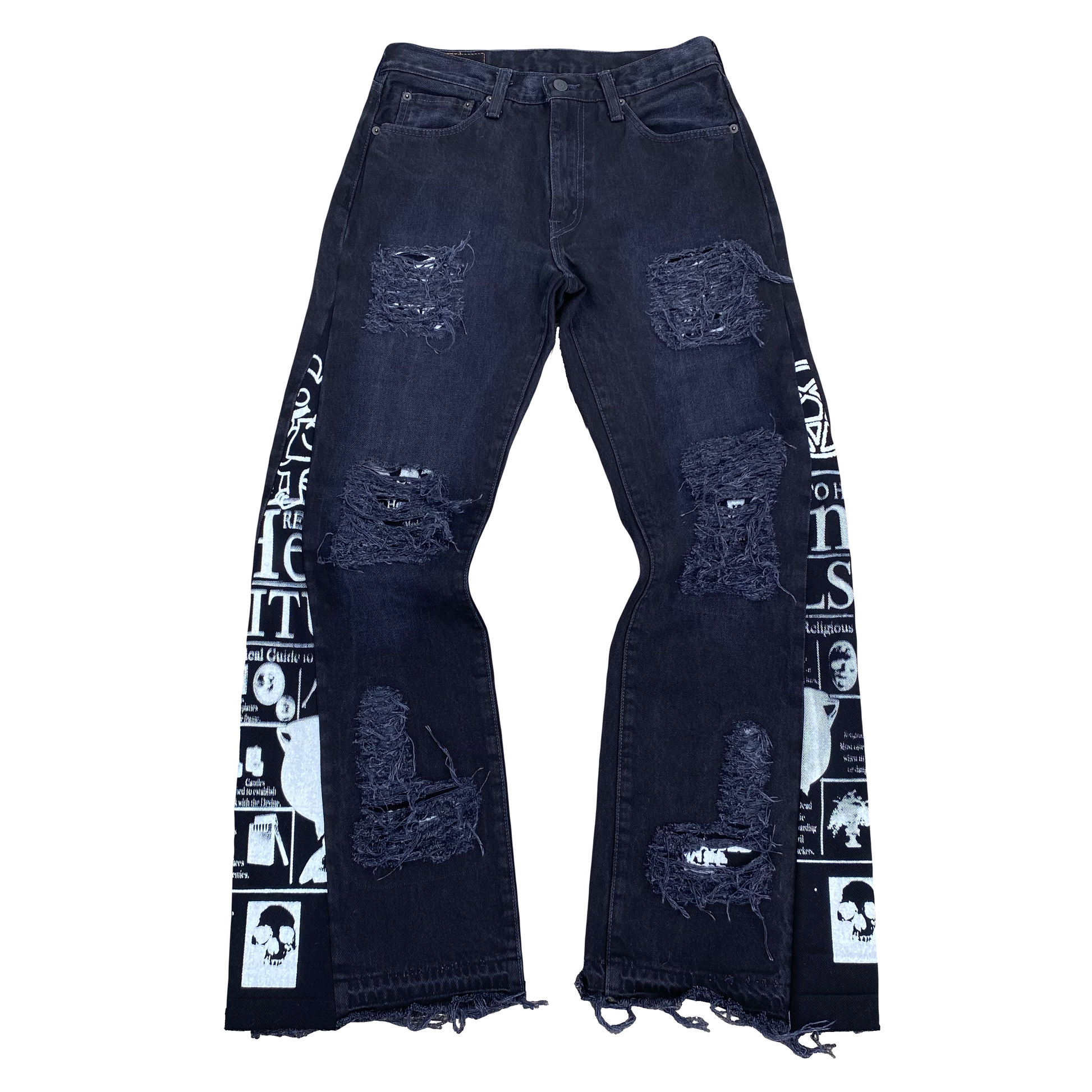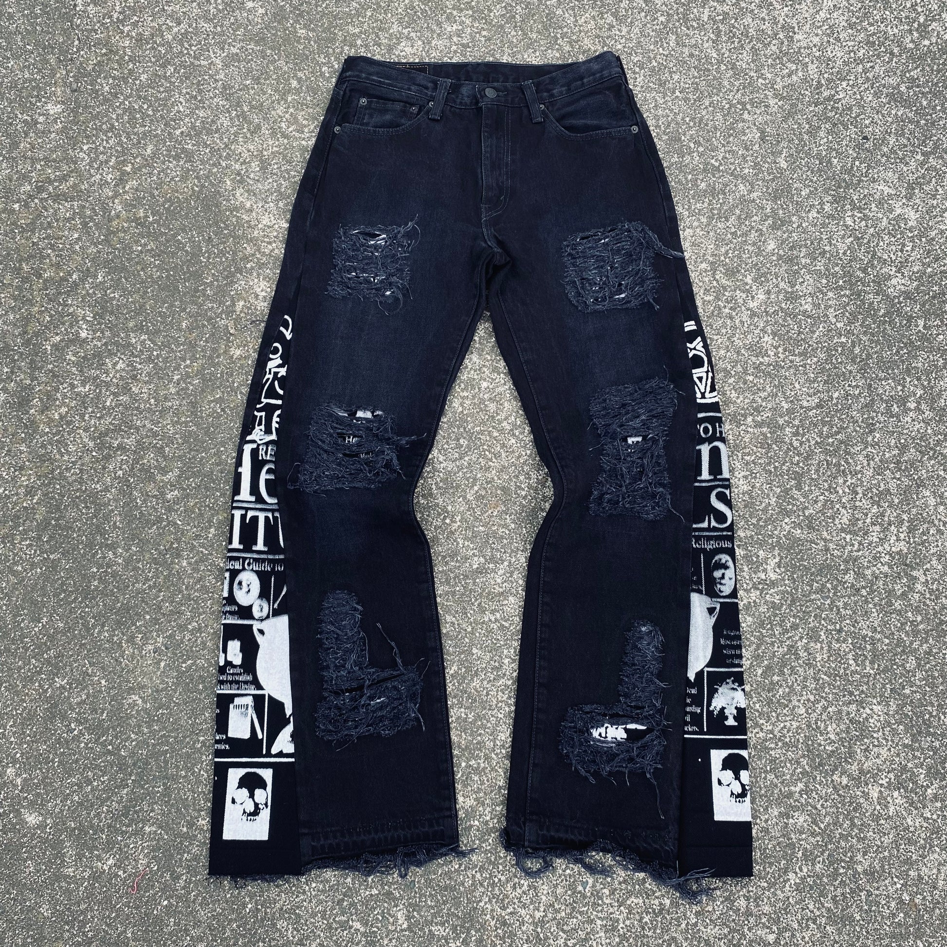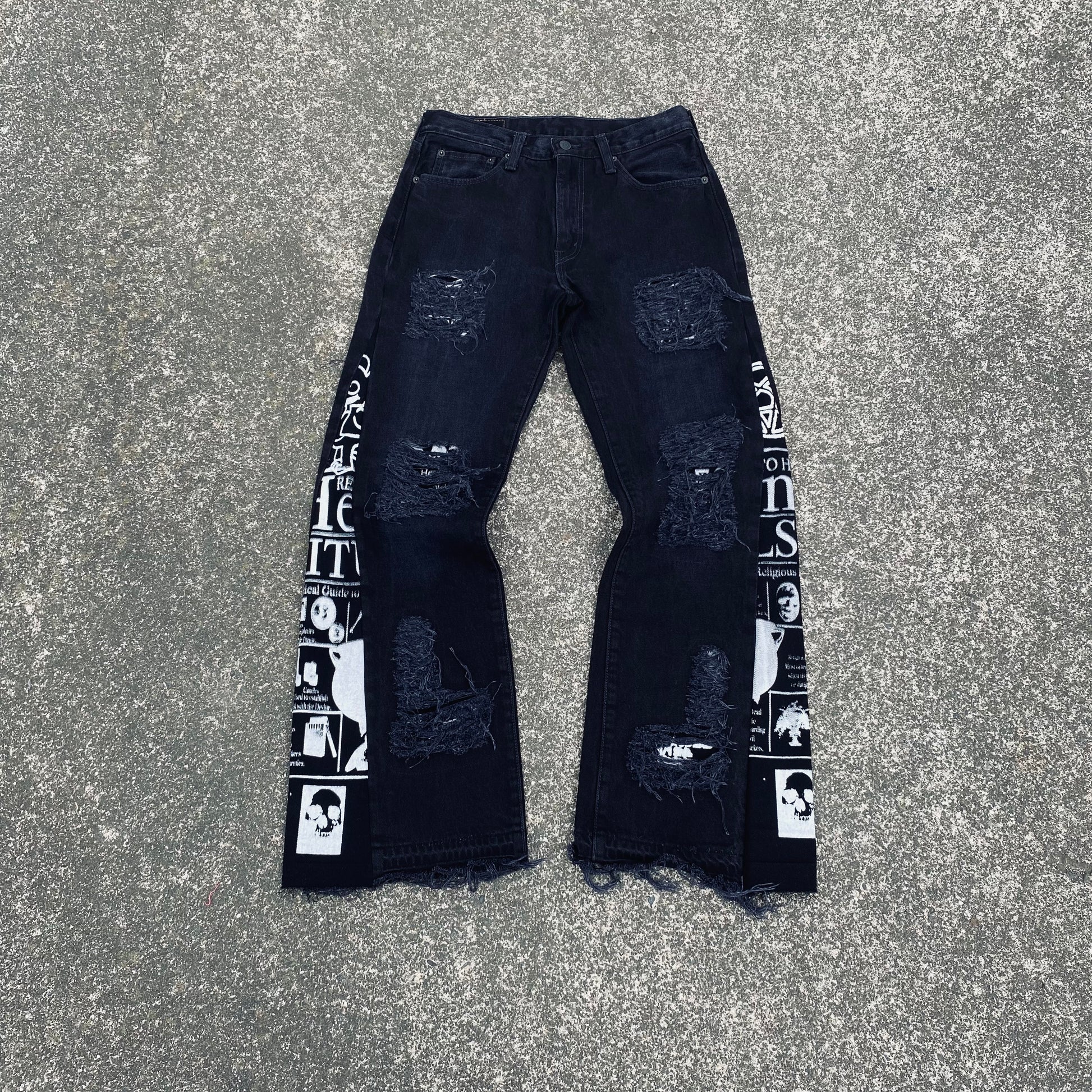 These Jeans were Hand screenprinted, Flared and patched by Diggy